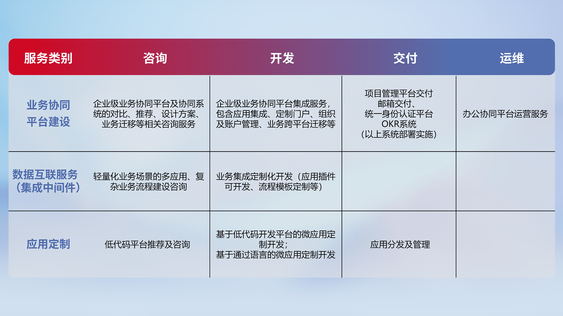 针对钉钉、、、、企微、、IDaas等平台级产品提供产品的规划、、、、方案、、交付、、定制化开发等服务,,,,实现如统一协同办公、、、智能客户服务、、混合会议管理、、智能数据查询、、、等业务场景,,实现数字化转型。。